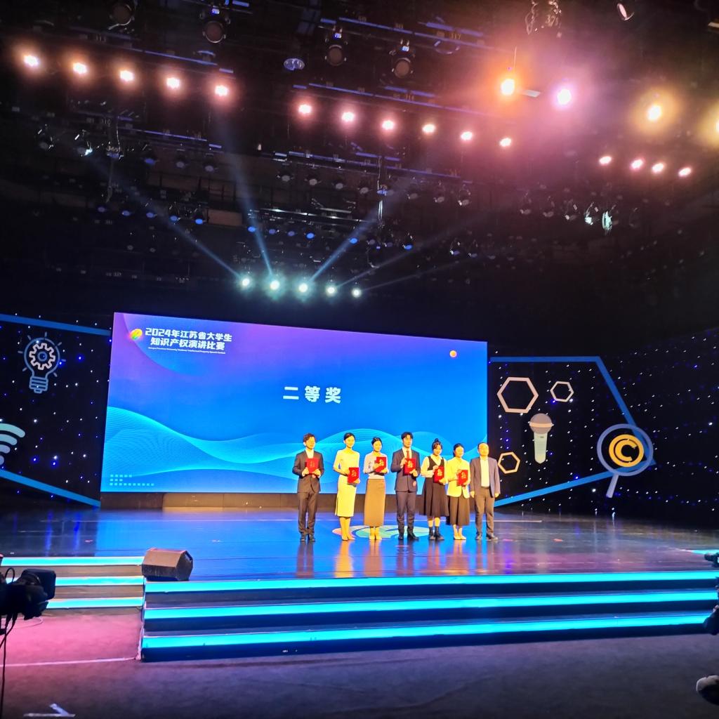 2024年江苏省大学生知识产权演讲竞赛决赛于2024年10月24日下午14时在南京广电大厦拉开帷幕。全省67所高校488位初赛选手参与了此次竞赛,该竞赛经过初赛、复赛和决赛三个环节,共有20位选手进入决赛环节。法律系2023级法控专业周乐同学入围决赛,周乐同学以《舌尖上的美酒,手心上的法》为题进行主题演讲,并以优异的成绩进入第二轮“即兴演讲”环节,最终周乐同学以总分94.584的成绩获得第七名,荣获决赛“二等奖”,指导老师戴仁卿获“优秀指导教师”荣誉称号,创造了历年法律系学子在该赛事中的最佳成绩。