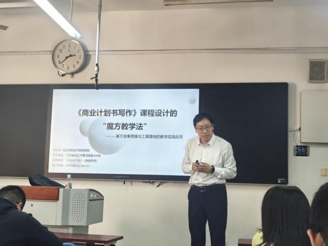 4月16日,经济管理学院副教授胡长深在4205教室举办了2025年第7期教学沙龙,聚焦《商业计划书写作》课程设计的“魔方教学法”,吸引众多师生参与。该教学法以魔方为隐喻,通过模块化、结构化、工具化的三维设计,为传统写作课程注入新活力,成为本次沙龙的核心亮点。