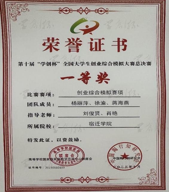 由高等学校国家级实验教学示范中心联席会经济与管理学科组、中国陶行知研究会主办的“学创杯”全国大学生创业模拟演练活动(创业营销赛项)总决赛及”学创杯“全国大学生创业综合模拟演练活动(主赛道)分别于2023年10月22日和10月29日在南京审计大学和黑龙江大学圆满落幕。创业营销赛道来自南京审计大学、扬州大学、江南大学等全国160所高校的800余参赛师生选手齐聚大赛进行了激励的角逐。我校经济管理学院2021级学生谭娇娇、曾倪洁、黄薪颖组成的团队荣获国家级一等奖;主赛道来自全国1496所高校的105430支队伍参加了比赛,我校经济管理学院2020级学生杨丽萍、徐渝、黄海燕组成的团队获得一等奖,实现了该项比赛两个赛道成绩的新突破。