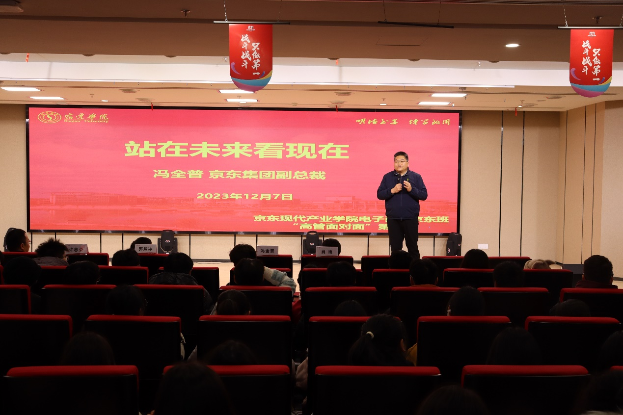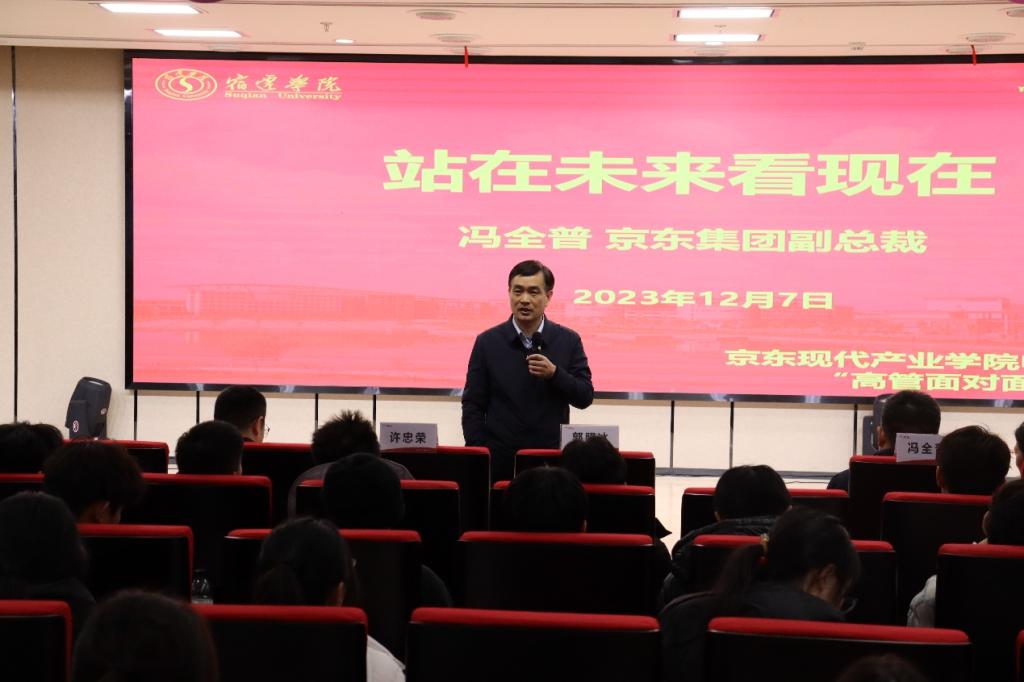 12月7日下午,在京东智慧城多功能会议室,京东集团副总裁、江苏省产业教授、宿迁学院特聘教授冯全普博士应邀为我校电子商务京东班学生作题为“站在未来看现在”的学术讲座,此次讲座也是京东班“高管面对面”系列活动的第一讲。讲座由校党委常委、副校长郭照冰主持。