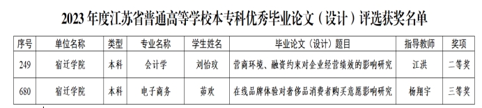 近日,江苏省教育厅公示了2023年度江苏省普通高校优秀本专科毕业论文(设计)评选结果,我院喜获二等奖1项,三等奖1项的好成绩。