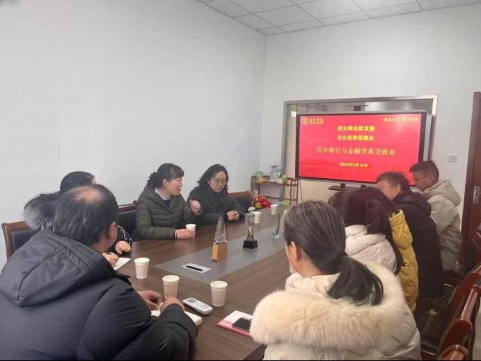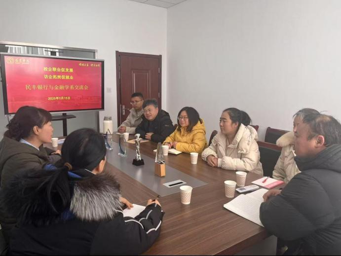 2025年1月15日上午,经济管理学院金融学系与民丰银行开展交流座谈会,共商校企联合促发展。民丰银行董事会秘书陆艳和西楚支行信贷部经理陈思羽、经济管理学院副院长姜丽丽、金融学系主任曹玲玲和金融学系骨干教师参加交流会。