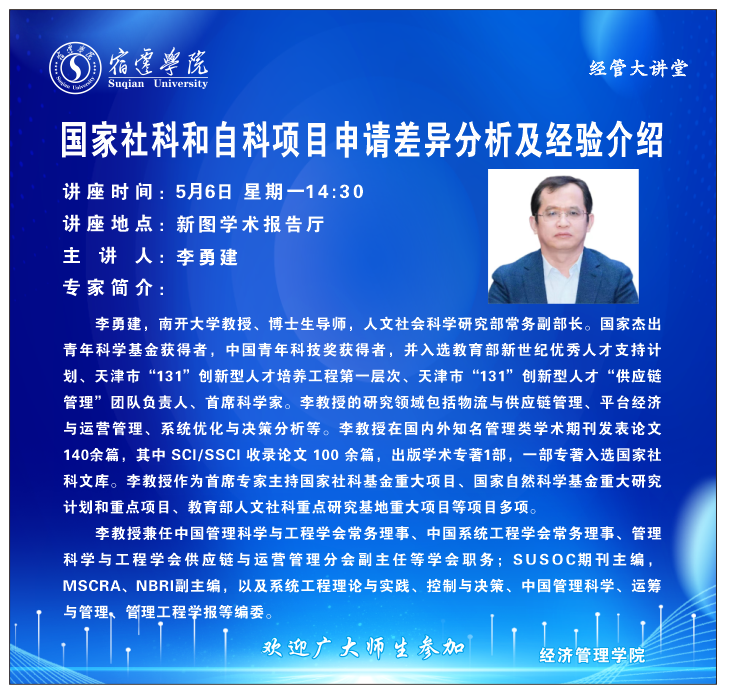 嘉宾简介:李勇建,南开大学教授、博士生导师,人文社会科学研究部常务副部长。国家杰出青年科学基金获得者,中国青年科技奖获得者,并入选教育部新世纪优秀人才支持计划、天津市“131”创新型人才培养工程第一层次、天津市“131”创新型人才“供应链管理”团队负责人、首席科学家。李教授的研究领域包括物流与供应链管理、平台经济与运营管理、系统优化与决策分析等。李教授在国内外知名管理类学术期刊发表论文140余篇,其中SCI/SSCI收录论文100余篇,出版学术专著1部,一部专著入选国家社科文库。李教授作为首席专家主持国家社科基金重大项目、国家自然科学基金重大研究计划和重点项目、教育部人文社科重点研究基地重大项目等项目多项。
