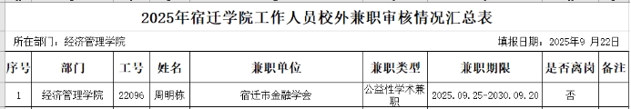 根据《宿迁学院教学科研人员校外兼职管理办法(试行)》(宿院〔2022〕4号)文件精神,经本人申请,学院党委会和党政联席会讨论、审批,现将学院教学科研人员校外兼职情况公示如下: