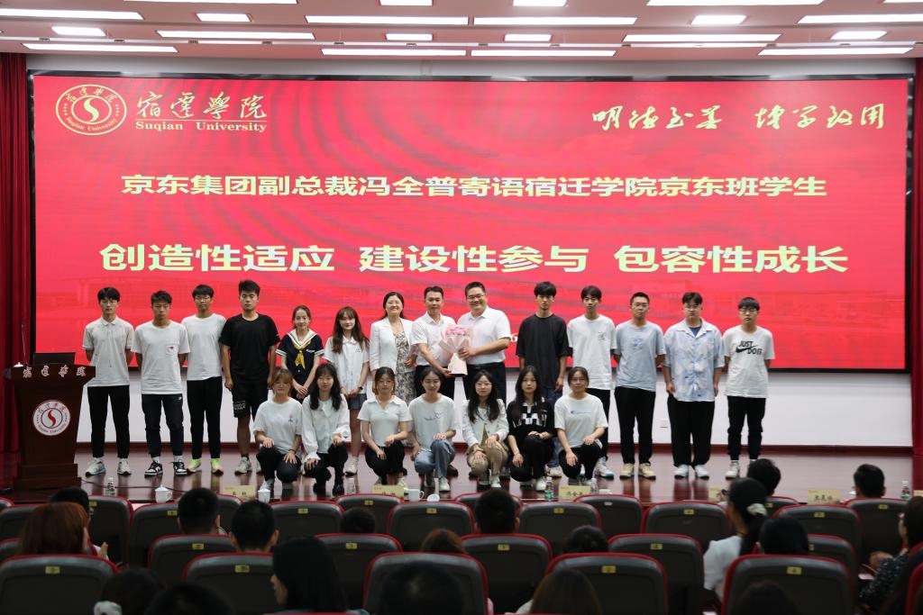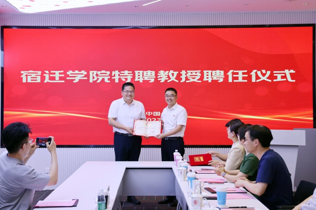 会前,我校在京东产教融合示范基地为冯全普副总裁举行了特聘教授聘任仪式。校党委书记徐德出席聘任仪式并致欢迎辞,徐德书记表示,冯全普副总裁的加入是学校一件大喜事,必将对京东现代产业学院的建设和学校高质量发展产生巨大的推动作用。仪式上,潘志明校长为冯全普副总裁颁发“宿迁学院特聘教授”及“宿迁学院京东现代产业学院创新创业导师”聘书。