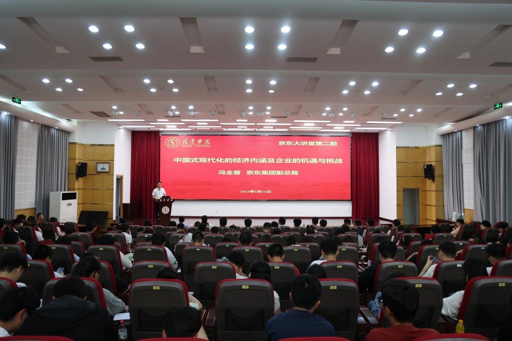 讲座中,冯全普副总裁以充满知识性、趣味性的语言,结合自身经历向同学们分享了考研时期的趣事,富有激情地介绍了中国式现代化的经济内涵以及京东集团的企业性质与发展理念,用丰富的案例讲述京东集团的商业价值、产业价值、社会价值,报告会现场气氛活跃、讨论热烈。最后,冯全普副总裁希望宿院青年学子要怀揣梦想且为之不断奋进、不断求索,寄语京东班学生要“创造性适应,建设性参与,包容性成长”。