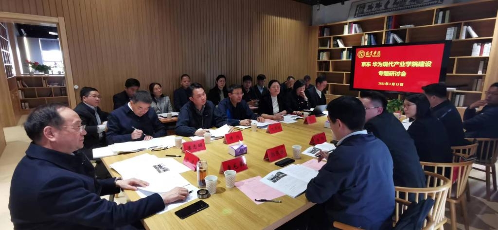 为深化产教融合,推进产业学院建设,3月13日下午,学校在京东产教融合示范基地会议室召开京东、华为现代产业学院建设专题研讨会。校党委书记徐德、校长潘志明出席会议并讲话,副校长童毛弟、侍旭参加研讨,副校长郭照冰主持会议。京东科技校企合作总经理杨程、学校相关职能部门及学院负责人参加会议。