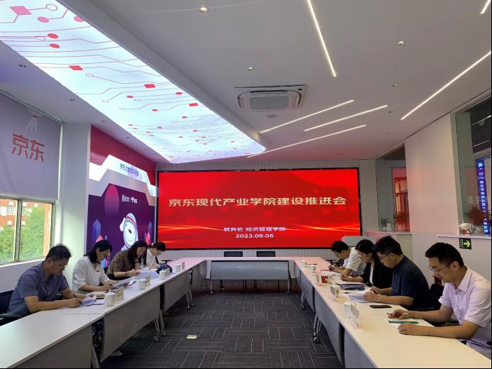 9月6日,经济管理学院在京东产教融合基地召开新学期京东现代产业学院建设推进会。校党委常委、统战部部长、教务处处长陆海霞,教务处副处长王凤侠,经管学院院长肖艳、副院长许忠荣以及相关教师参与座谈。