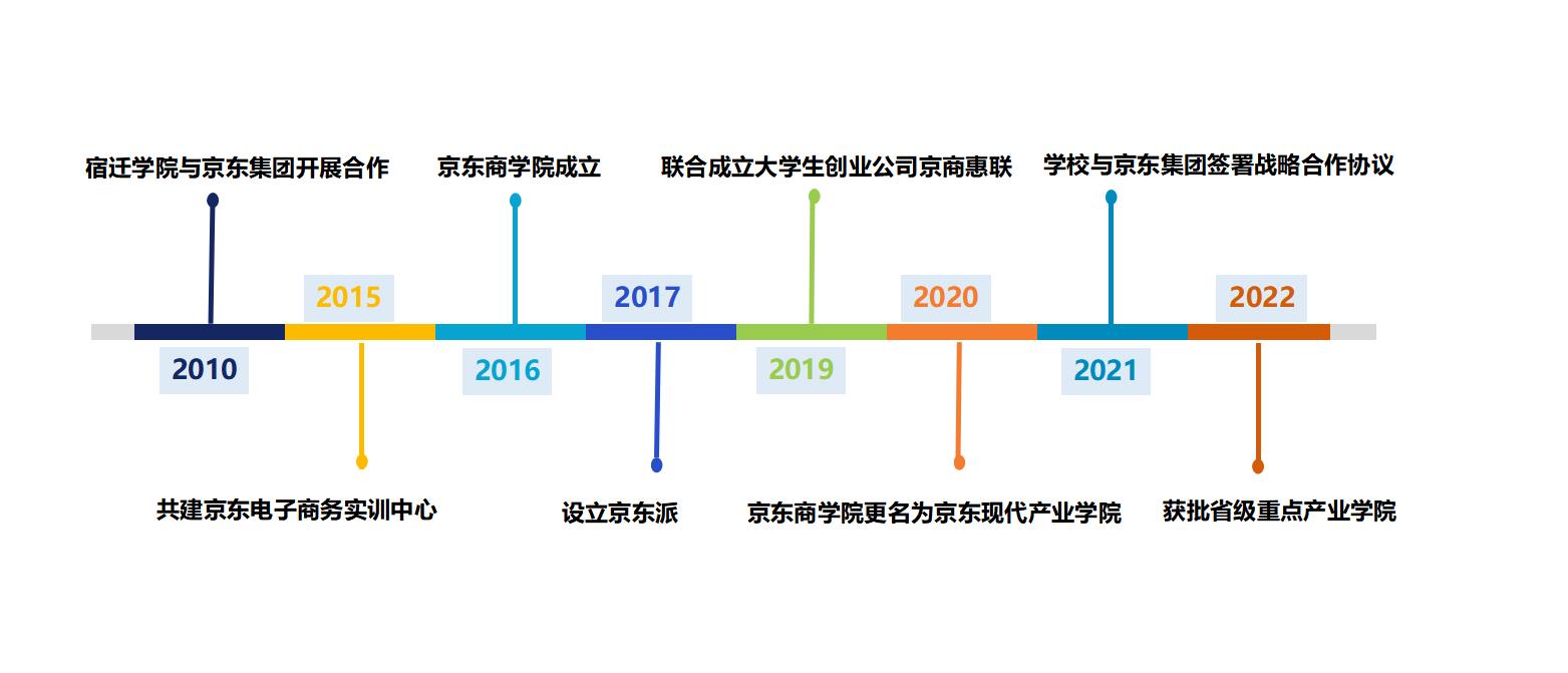 京东现代产业学院由宿迁学院、京东集团、宿迁市政府等合作共建,旨在围绕现代服务产业数字化转型和智能制造产业发展需求,在智慧物流管理、智能物流装备制造、大数据分析与应用、电商运营与管理等领域,培养精数据应用、懂电商物流、善协作创新的应用型人才,共同打造特色鲜明的政企园学共赢的现代产业学院。 2010年,宿迁学院与京东开启合作,砥砺前行10余年。产业学院大力推进产教融合、协同育人,互派高层次人才挂职锻炼,共建大数据分析与应用等实验室、智慧物流等研究中心等,共建专业6个、获批江苏省产教融合型品牌专业2个,产教融合课程18门,联合编写教材4部,已设立京东开放基金项目16项。在校内建成近3000平米的京东产教融合示范基地,为学生的实习实训、双创教育提供了有力保障,也为教学改革和科研合作提供了数据和技术支撑。牵头成立中国电⼦商会产教融合专业委员会,成立京东教育研究院(宿迁)研究院,京东现代产业学院获批江苏省重点产业学院。同时,学院将京东“正道成功”“家国情怀”等企业文化有机融入课程思政与实习实训,切实增强学生产业报国、创业富民的使命感与责任感。